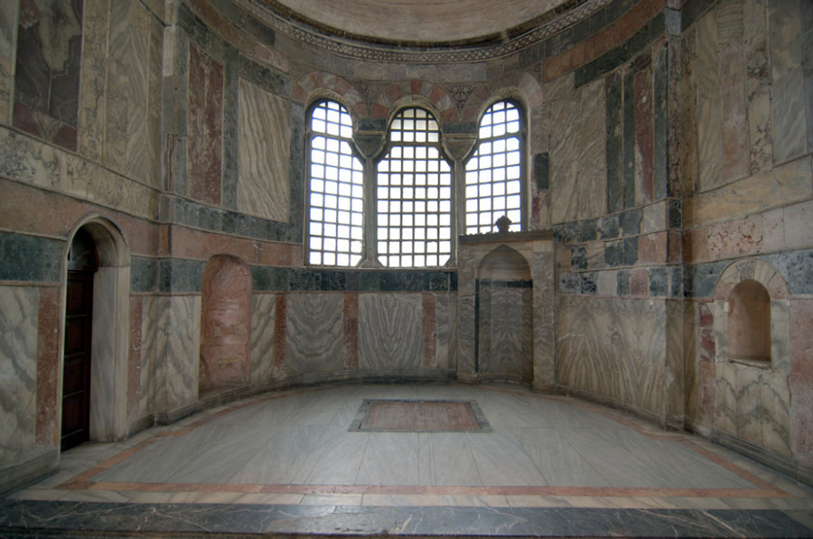 The building consists of the nave, the inner narthex, outer narthex and the paracclesion. The domes of the inner narthex and the paracclesion are lower than the main dome and are only seen from the rear of the church. The drum is supported on four huge pilasters in the corners and four great arches spring from these. The transition is supplied by pendentives. The drum has 16 flutes, each pierced by a window. Entrance to the nave is through both inner and outer narthexes. The niches in the paracclesion were built to keep sarcophagi, as this section was the funerary chapel.