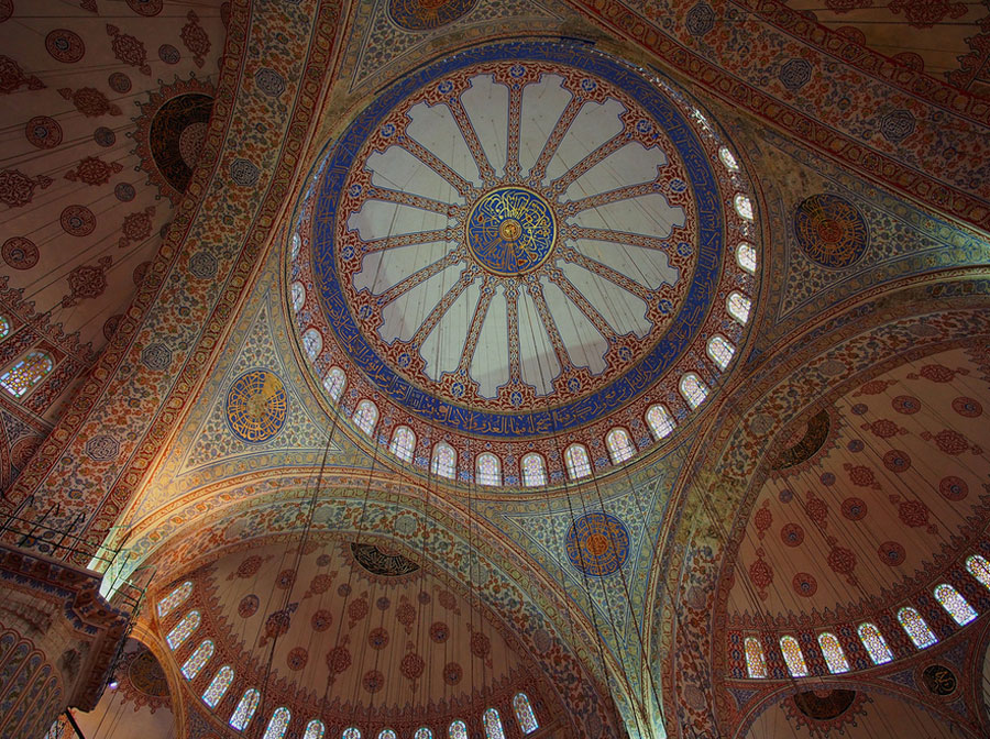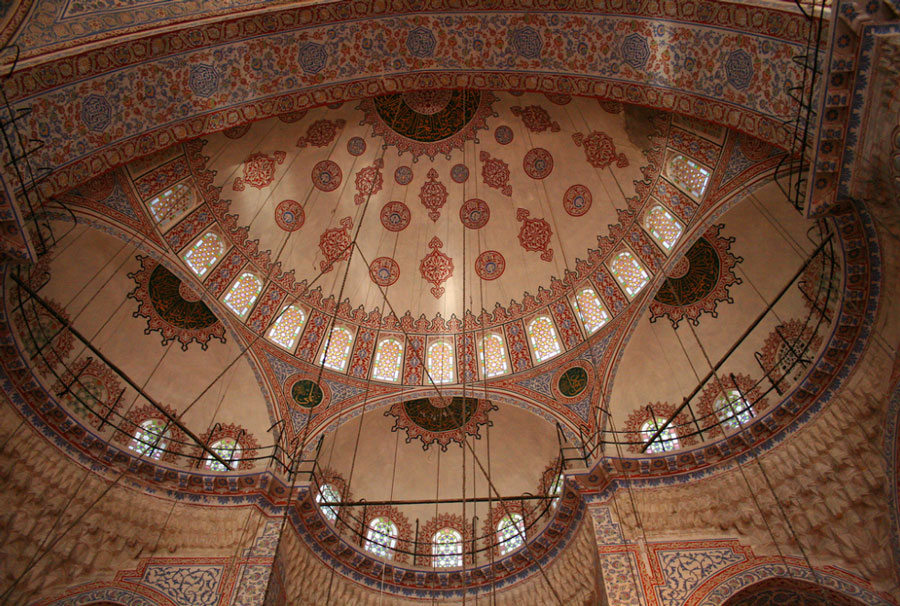 The Sultanahmet Mosque, known as the Blue Mosque, is the central element of the complex built by Ahmed I (1603-1617) and was completed after the sultan's death in 1617. Its architect is Mehmed Aga (d.1622), whose epithet "Sedefkar" refers to his mastery in mother-of-pearl. The mosque is considered to be the last example of Ottoman classical architecture; Mehmed Aga was an apprentice under Sinan (1450?-1588) and Davud Aga (d.1598), two architects whose works have defined the style of this period.