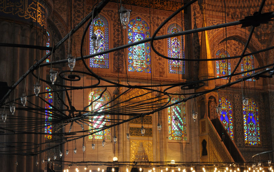 The Sultanahmet Mosque has the unusual feature of having six minarets, four of which rise from the corners mosque and two lower minarets placed at the front corners of the courtyard. The four around the mosque have three balconies each, while the courtyard minarets are furnished with two. All six minarets have fluted shafts and balconies with stalactite corbels. The northeastern minaret was restored in 1955.