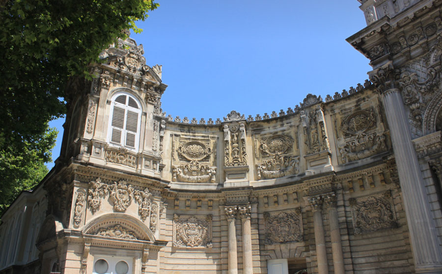 The Dolmabahce Palace is an impressive building facing the sea with very high walls on the side facing inland. The main building is surrounded by magnificent palace gardens. There are nine gates on the inland side, two of which are monumental. On the front facing the sea there are five gates.