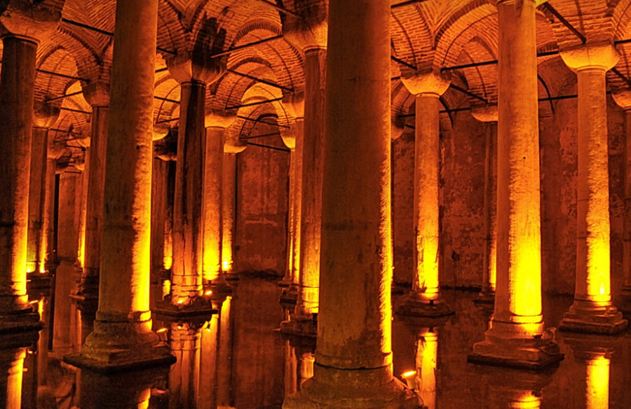 Istanbul was one of the most often besieged cities in the world and has always needed permanent water supplies. And as a result many underground cisterns were built during the Byzantine Empire. Water was brought to these big reservoirs from far away sources through aqueducts. It is still possible to see remains of a large aqueduct in Unkapani. This is called Bozdogan Kemeri (Aqueduct of Valens) and was built in 375 AD by the Emperor Valens. Because Turks have always preferred running water, after capturing the city from the Byzantines, they did not use cisterns properly. Most of them were usually converted into either small bazaars or storehouses. The largest and most ornate of these cisterns is Yerebatan Sarayi. In its construction, columns and capitals of earlier temples were used and this provides a very decorative appearance. This is why it is called saray which means “palace” in Turkish.